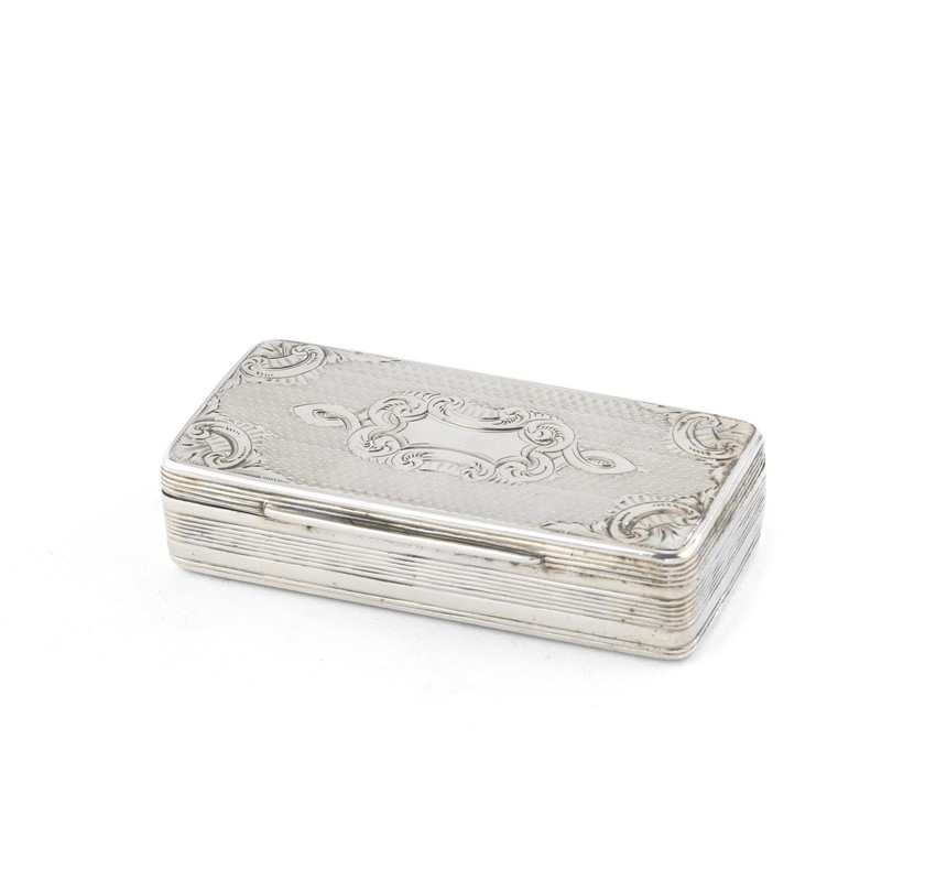 in argento, di forma rettangolare, coperchio guillochè con riserva di volute al centro, cm 8,5x4x2, g 90