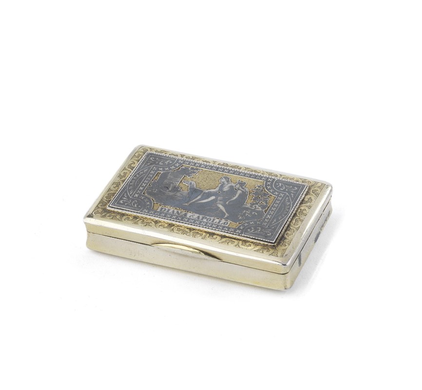 in argento e argento dorato di forma rettangolare, al centro del coperchio Apollo e Diana in niello, cm 8x4,8x1,5, g 100