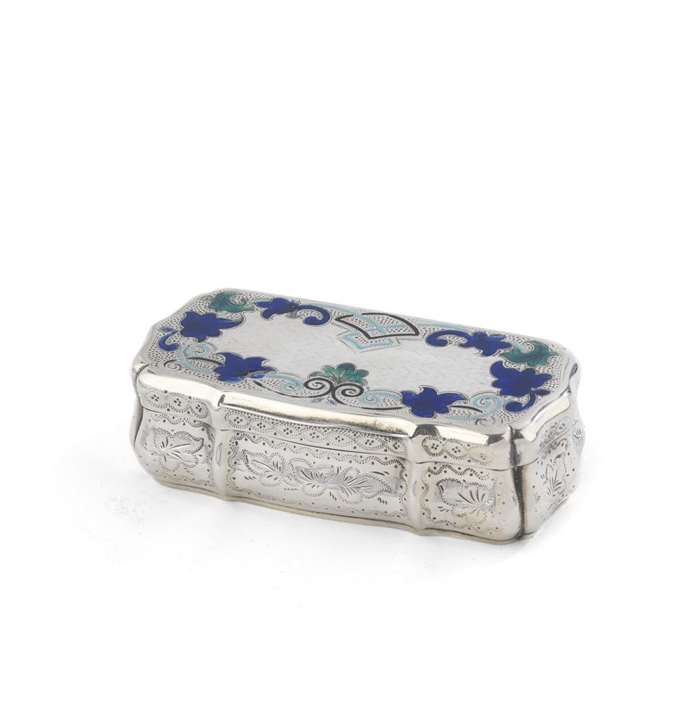 in argento, di forma rettangolare sagomata, coperchio finemente cesellato ed inciso, coperchio profilato da un fregio di foglie in smalto blu e verde acqua, sul fondo l'incisione All'Amice, cm 9x4,5x2,5, g 90