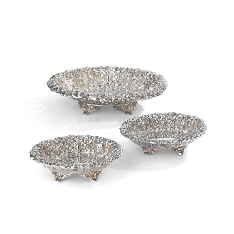 TRE VASCHETTE, LONDRA, 1894, ARGENTIERE HORACE WOODWARD & CO di forma ovale in argento sbalzato e traforato a volute e fiori, cm 19x15 e cm 30x24. complessivi g 765