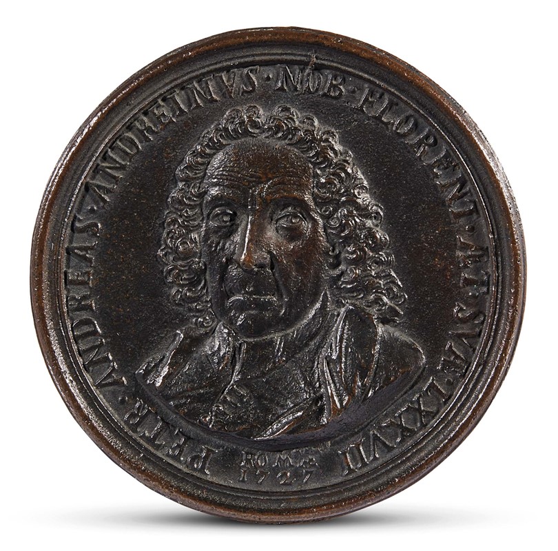 Fronte. Busto quasi frontale con lunghi capelli riccioluti. Iscrizione PETR.ANDREAS.ANDREINVS.NOB.FLORENT.AET.SVAE.LXXVII. Sotto la troncatura del busto su due righe ROMAE/1727.