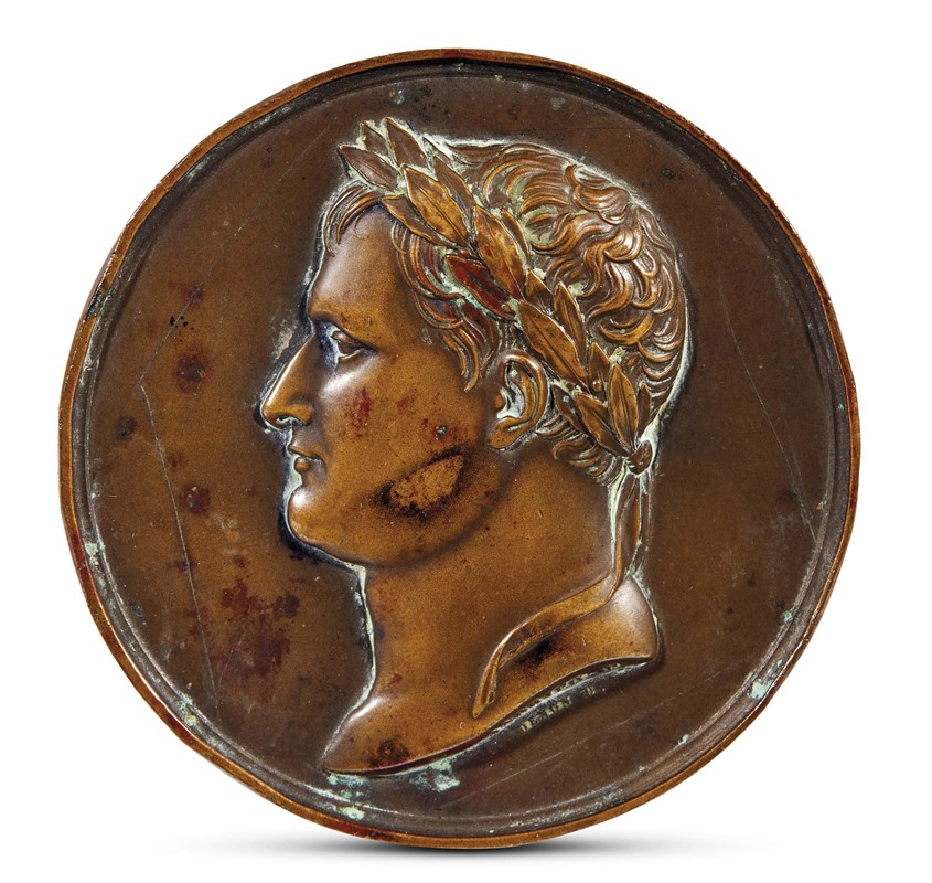 Bertrand Andrieu (Bordeaux 1761-1822) NAPOLEONE, 1811 medaglia in bronzo, coniata, diam. cm 6,8. Fronte. Testa laureata a sinistra. Nella troncatura del busto ANDRIEU F., sotto la troncatura DENON. Retro. Napoleone solleva un neonato sul fonte battesimale. Iscrizione lungo il bordo ANDRIEU FECIT. In esergo su due righe BAPTEME DU ROI DE ROME/M.DCCCXI