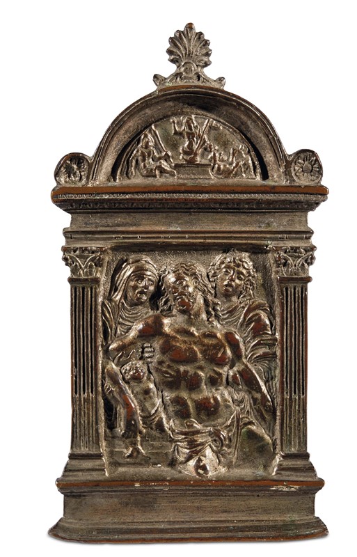Workshop of the Moderno, 16th century, Crucified Christ between the Virgin and Saint John, bronze