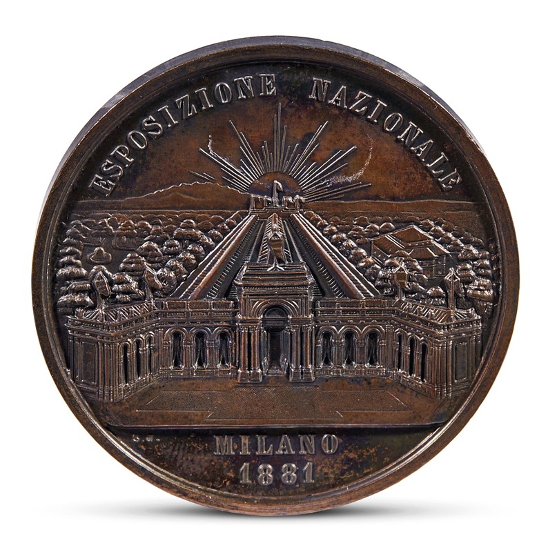 Retro. Veduta dell'edificio dell' esposizione, entro parco, con sole raggiante sullo sfondo. Iscrizione ESPOSIZIONE NAZIONALE. In esergo: MILANO – 1881; in esergo a sinistra: S.J. Completa di scatola originale