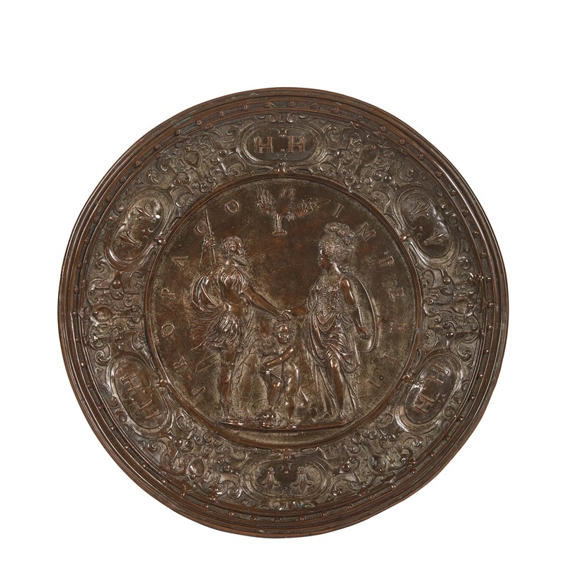 piatto in rame sbalzato applicato su bronzo, ispirato alla celebre medaglia realizzata nel 1603 dal Dupré raffigurante Enrico IV, Maria de' Medici e il Delfino, diam. cm 31,2