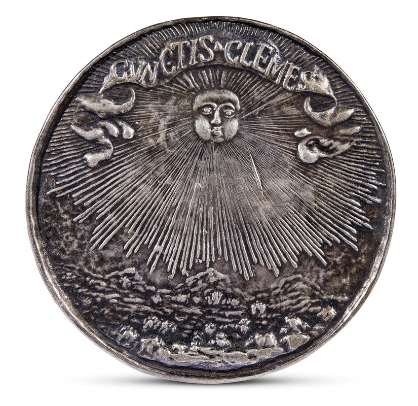 Retro. Sole radiato a faccia umana sormontato da cartiglio iscritto CVNCTIS.CLEMENS.
