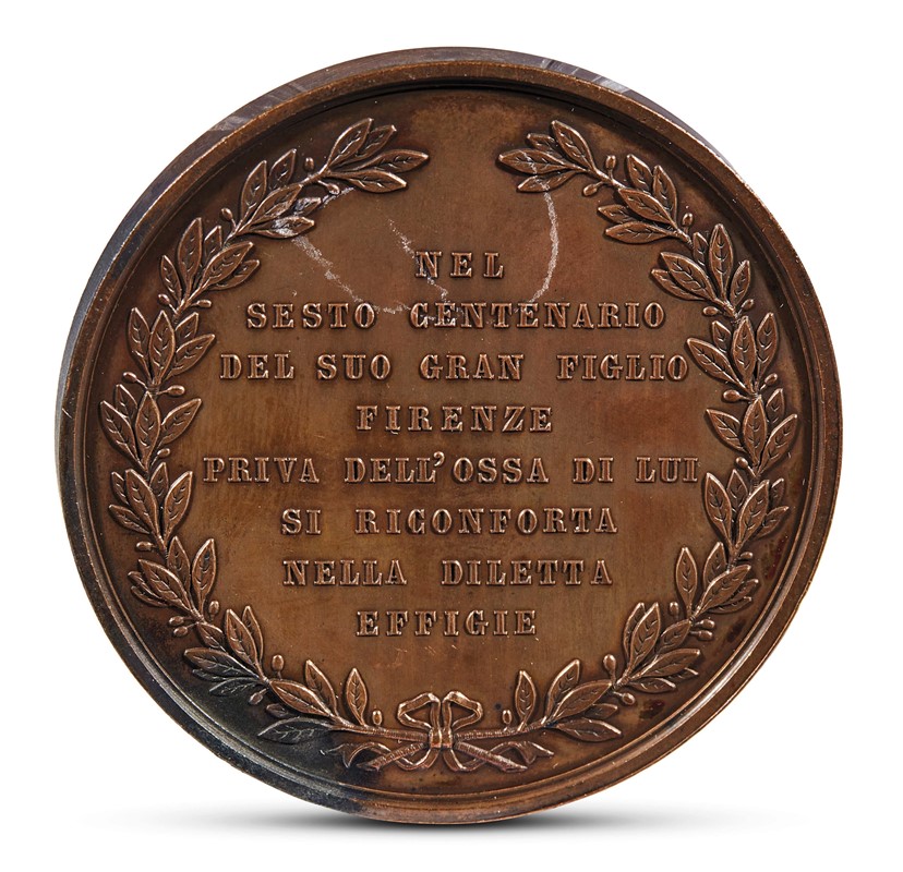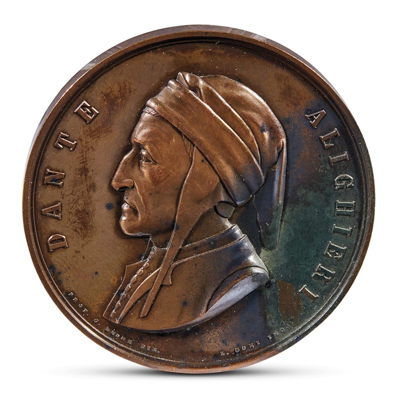 G. Duprè, L. Gori DANTE ALIGHIERI, 1865 medaglia in bronzo, diam. cm 5. Fronte. Busto a sinistra con cappuccio e tunica. Iscrizione DANTE ALIGHIERI. In basso: PROF. G. DUPRE' DIR. - L. GORI INC. Retro. Entro rami d'alloro legati in basso da nastro iscrizione: NEL - SESTO CENTENARIO - DEL SUO GRAN FIGLIO - FIRENZE - PRIVA DELL'OSSA DI LUI - SI RICONFORTA - NELLA DILETTA - EFFIGIE. Completa di scatola originale