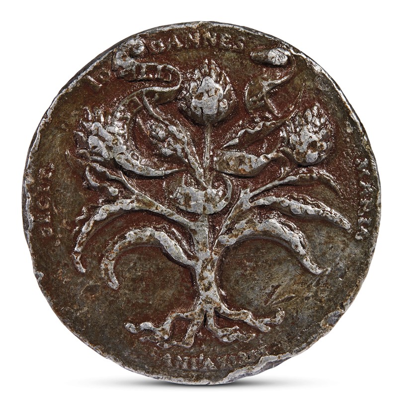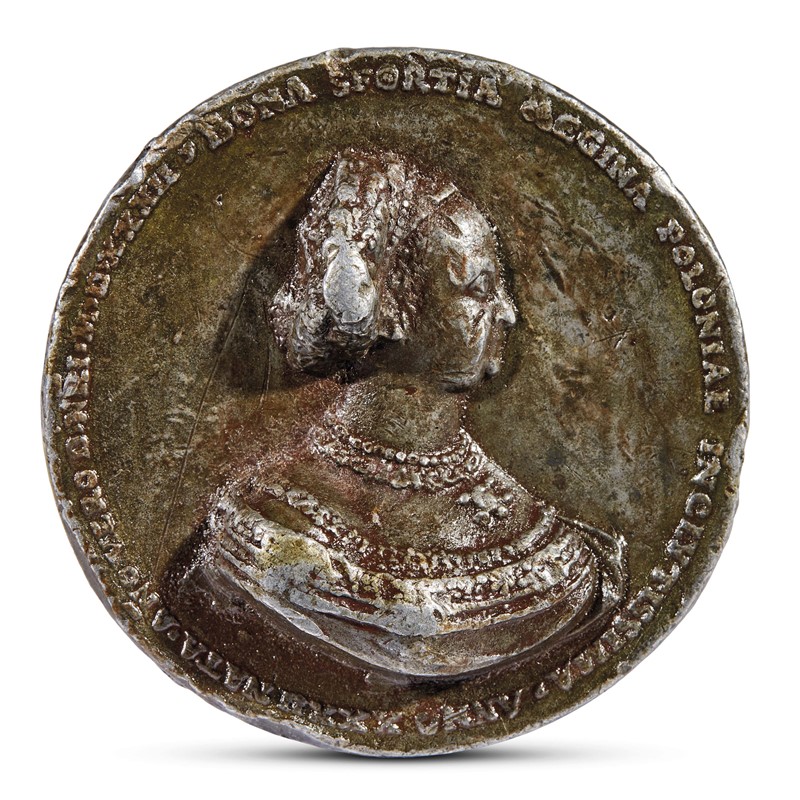 Giovanni Maria Mosca (Padova 1495 - dopo il 1573) BONA SFORZA medaglia in bronzo, diam. cm 6,8. Fronte. Busto a destra con capelli raccolti, veste scollata e collana con pendente. Iscrizione BONA SFORTIA REGINA POLONIAE INCLYTISSIMA.ANNO XXXII NATA.ANO VERO D.NRI.M.D.XXXII. Verso. Pianta di carciofo con nastro svolazzante iscritto TALIS EST.QVAE.FERT. Iscrizione IOHANNES MARIA PATAVINVS FECIT