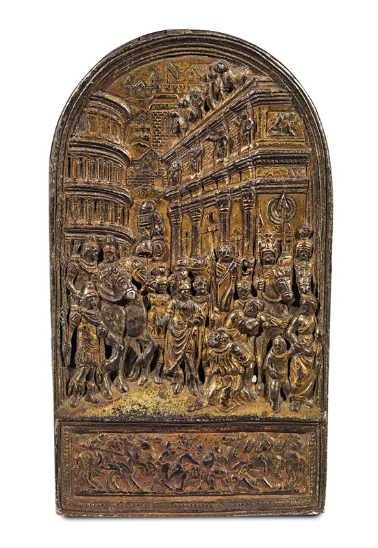 placchetta centinata in bronzo dorato, cm 9,4x5,4