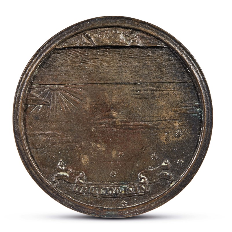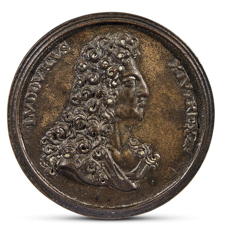 Italia, secolo XVII LUIGI XIV medaglia in bronzo, diam. cm 8,4. Fronte. Busto a destra con lunghi riccioli e mantello drappeggiato. Iscrizione LVDOVICVS XIV.REX. Retro. Veduta marina con sole al tramonto e cielo stellato. Iscrizione NISI OCCIDAT entro cartiglio