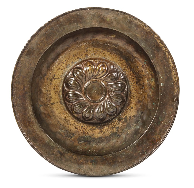 in bronzo sbalzato, tesa piatta incisa a bulino con fogliette ricorrenti decorato al centro con motivo di baccellatura obliqua entro iscrizione a caratteri gotici su fondo bulinato cui segue sottile fascia a fogliette ricorrenti, diam. cm 47,3