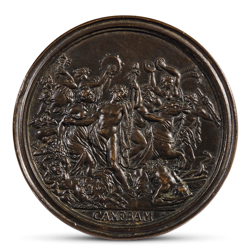 Retro. Bacco, Sileno, satiri e baccanti; all’esergo CANEBAM
