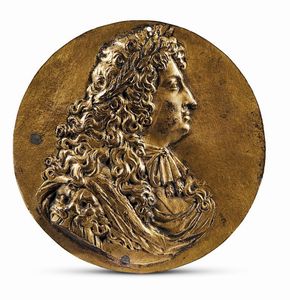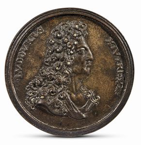 Italia, secolo XVII LUIGI XIV medaglia in bronzo, diam. cm 8,4. Fronte. Busto a destra con lunghi riccioli e mantello [..]