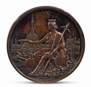 C. Ferrario, A. Bergamaschi ESPOSIZIONE NAZIONALE MILANO, 1861 medaglia in bronzo, diam. cm 4,6. Fronte. La figura [..]