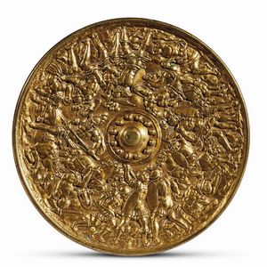 Italia settentrionale, secolo XVI BATTAGLIA placchetta circolare in bronzo dorato, diam. cm 9,5 Northern Italian, [..]