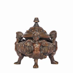Veneto, secolo XIX CALAMAIO in bronzo patinato, contenitore circolare su tre piedi con putti alati, coperchio [..]