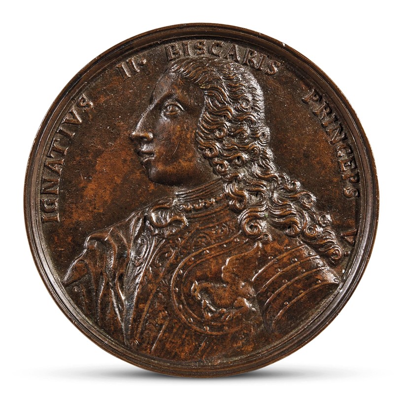 Fronte. Busto corazzato a sinistra con lunga parrucca riccioluta e mantello sulla spalla destra. Iscrizione IGNATIVS II.BISCARIS PRINCEPS V.