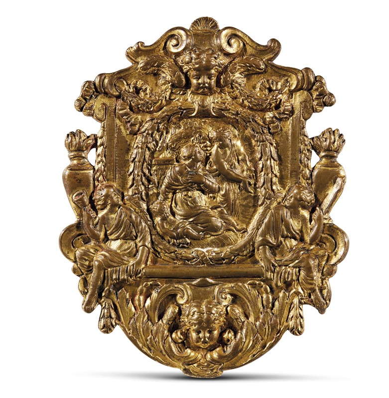 placca sagomata in bronzo dorato, cm 14,2x11,4