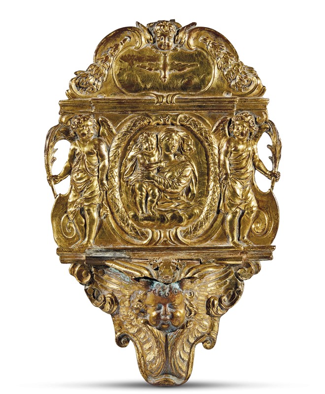 Venetian, early 17th century, holy water font with the Madonna with Child, gilt bronze and gilt copper