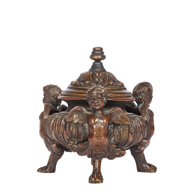 in bronzo patinato, contenitore circolare su tre piedi con putti alati, coperchio con presa a trottola, cm 10x9x9