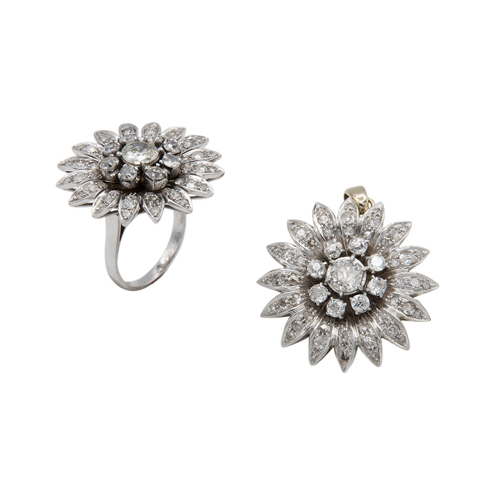 Circa 1880. Montati ad anello e ciondolo nel 1960 ca. 2 diamanti per 2 ct ca. e diamanti per 3.30 ct ca. Peso complessivo 26,80 gr