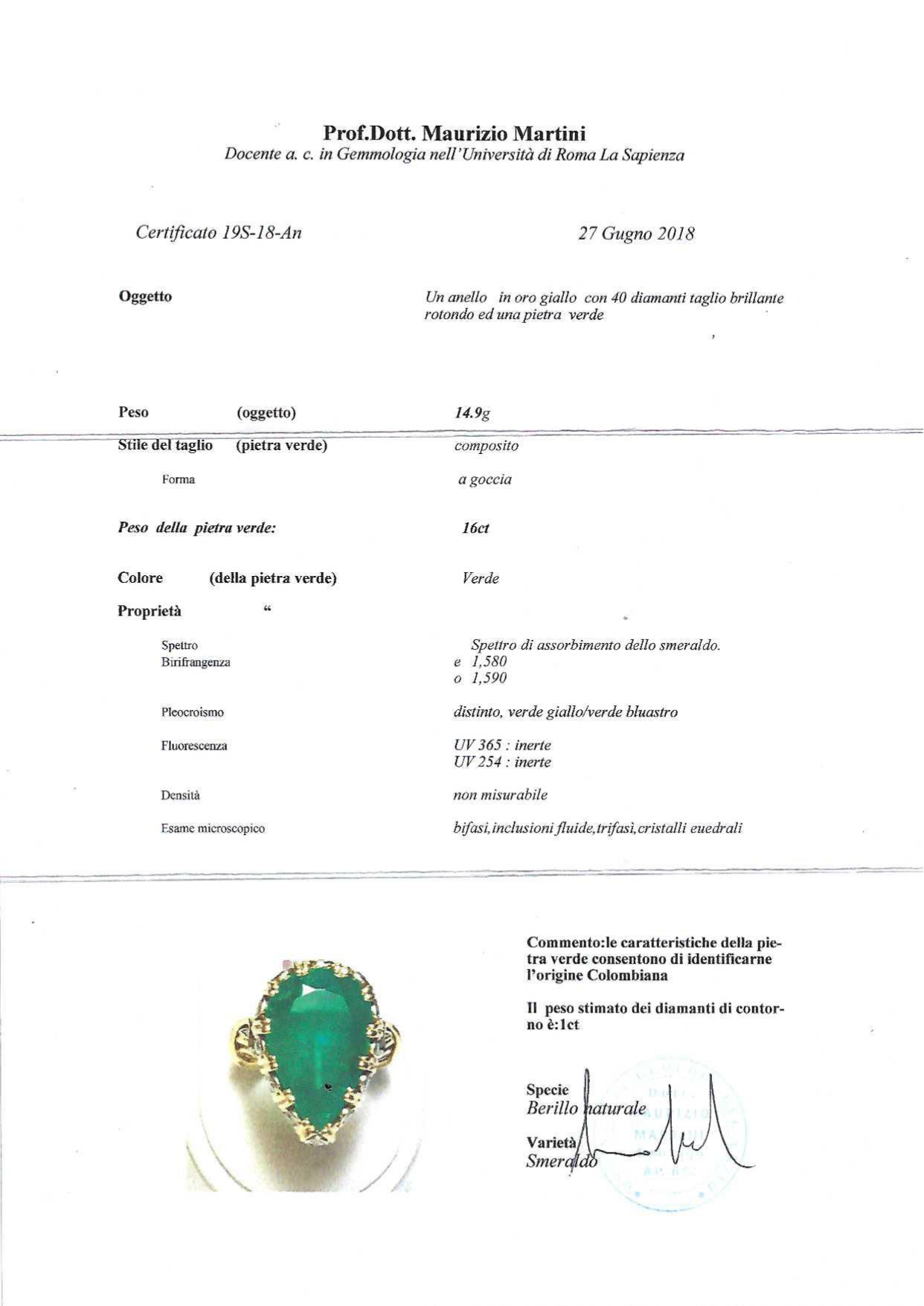 Anello in oro 18 kt con smeraldo colombiano centrale di 16 ct. Brillanti per 1 ct ca. Peso complessivo 14,90 gr. Certificato gemmologico Dott. Maurizio Martini 19S-18-An