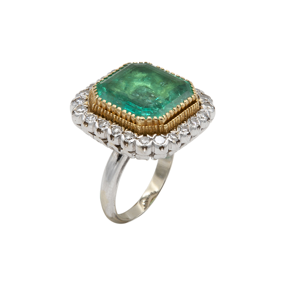 Anello con smeraldo e diamanti. Smeraldi per 10 ct ca. Diamanti taglio huit-huit per 0,50 ct ca. Misura 14.