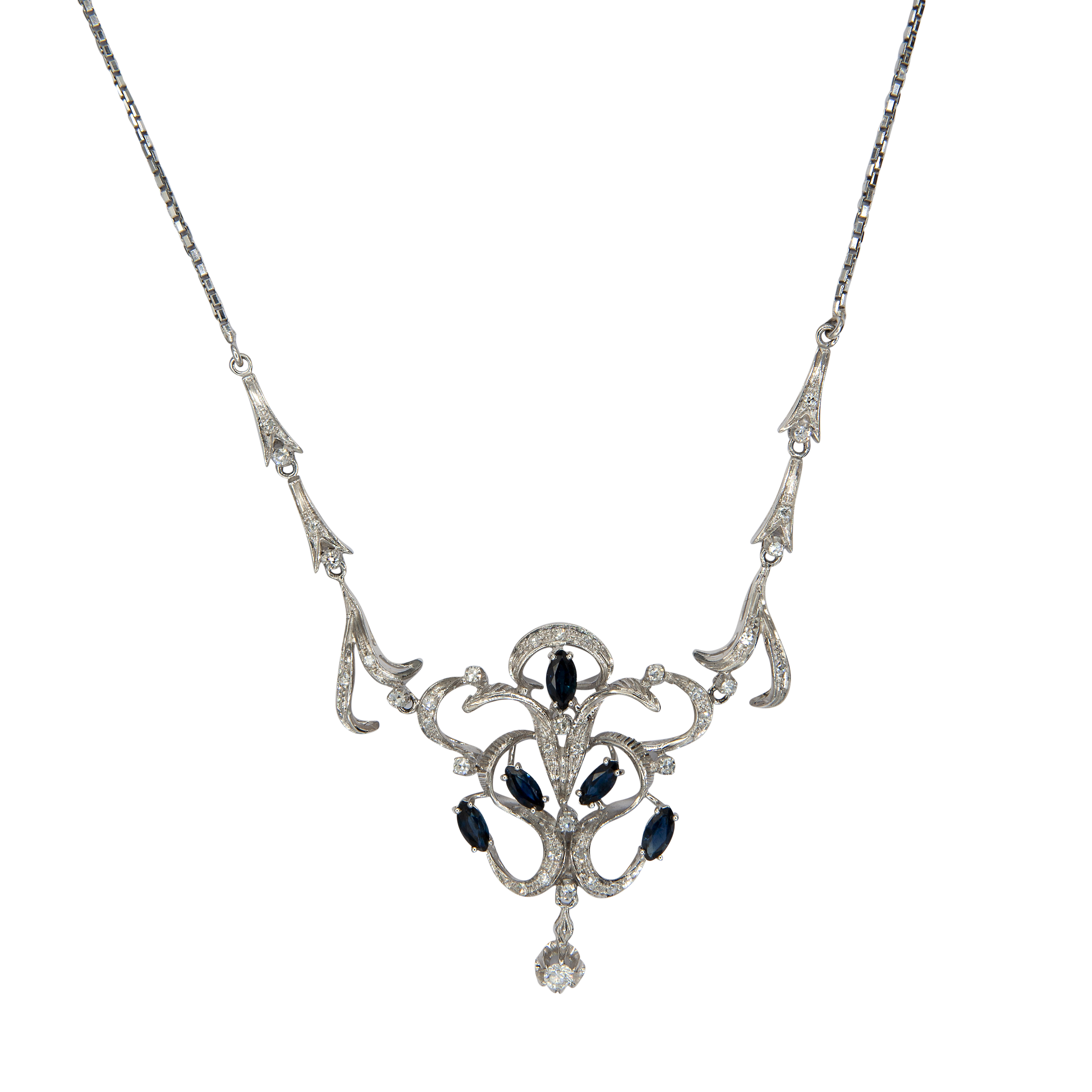 Collana in oro bianco 18 kt con zaffiri e diamanti. 5 zaffiri taglio marquise per 0,50 ct ca. Diamanti taglio brillante per 0,9 ct ca. Lunghezza 22 cm. Misure pendente 4x4 cm. Peso complessivo 16 gr.