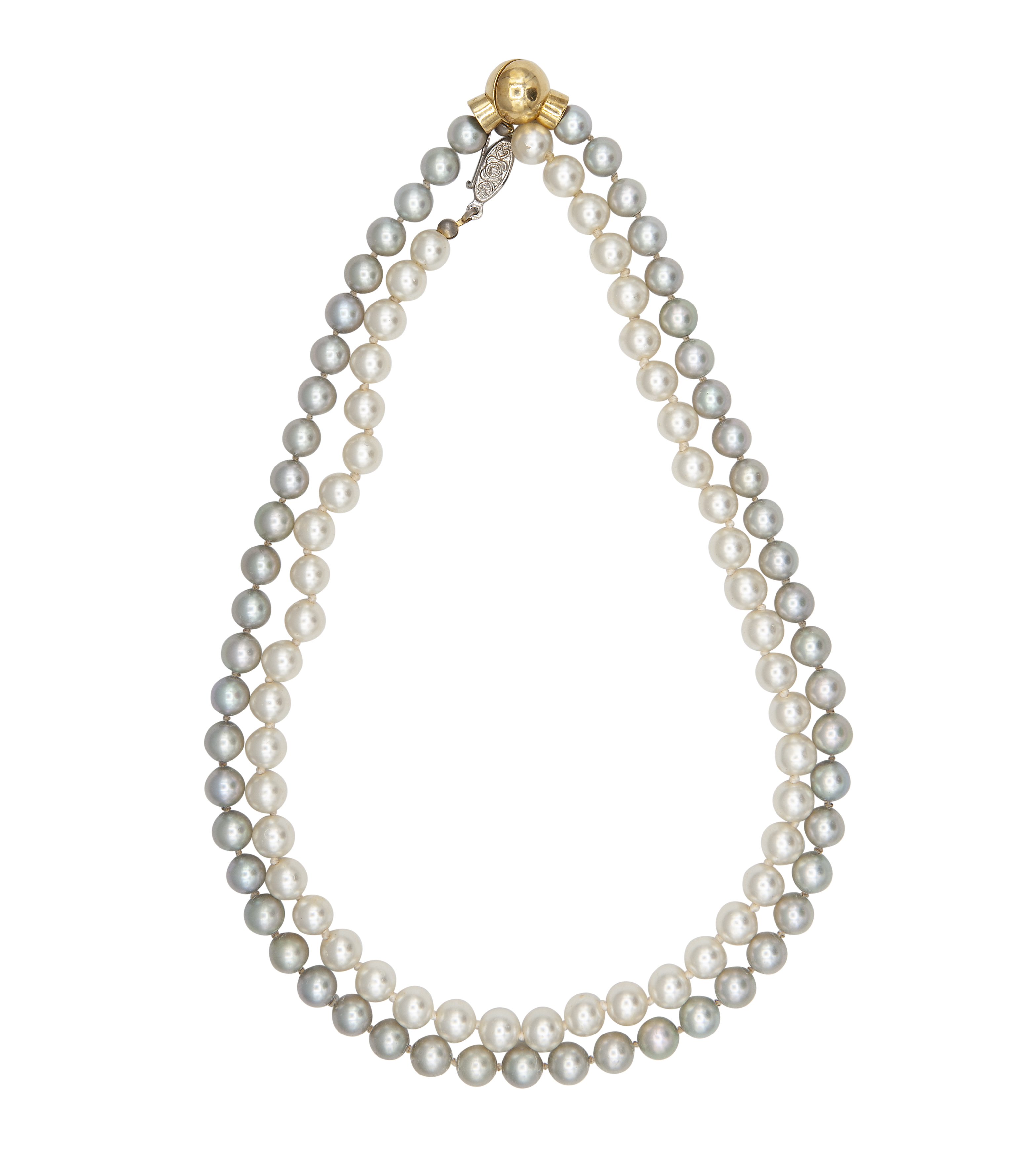 Un filo di perle thaiti e un filo con sfere bianche. Diametro mm 8,2 mm.