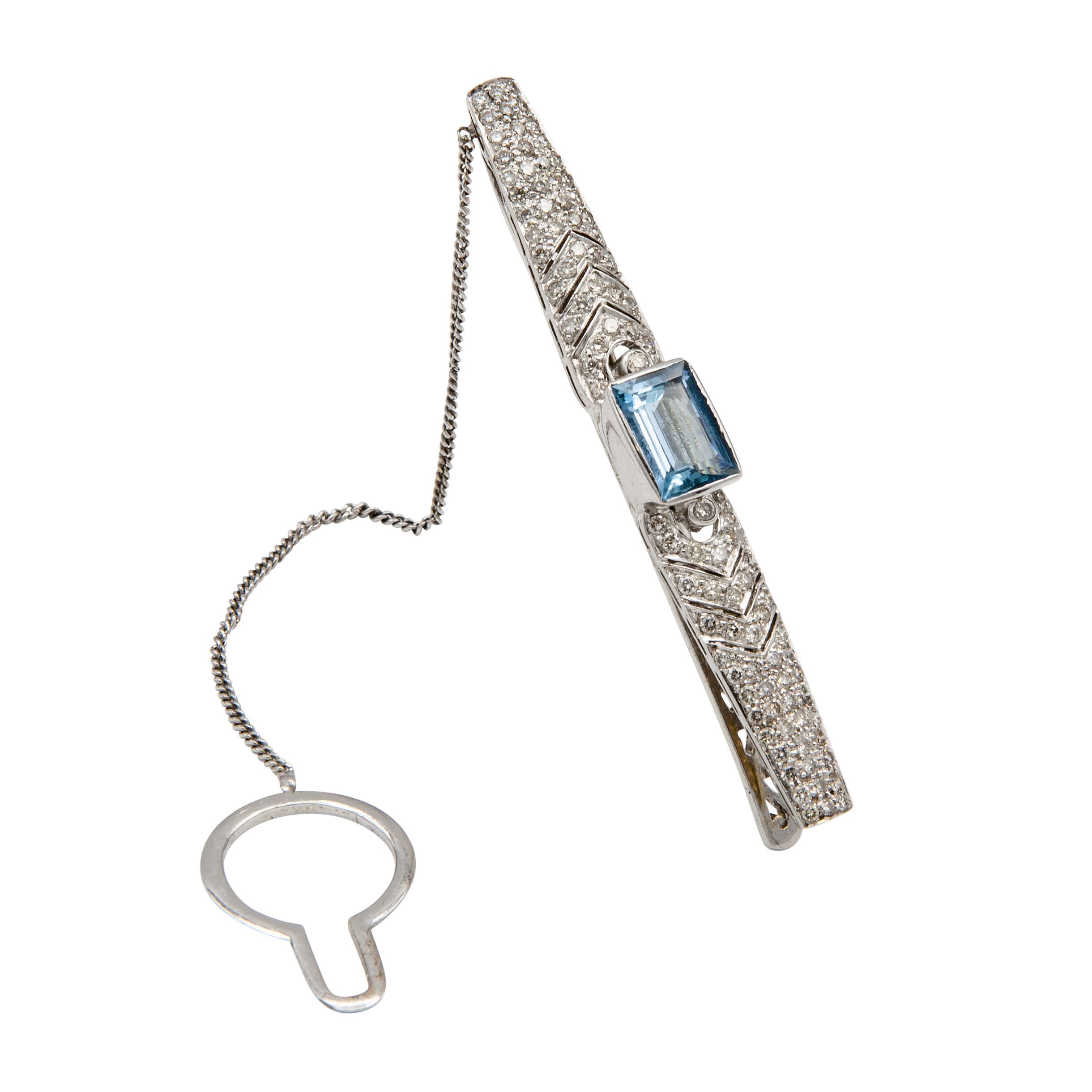 Fermacravatte in oro 18kt con acquamarina e diamanti. Acquamarina di 2,5 ct ca. Peso complessivo 9,20 gr. Lunghezza 6 cm
