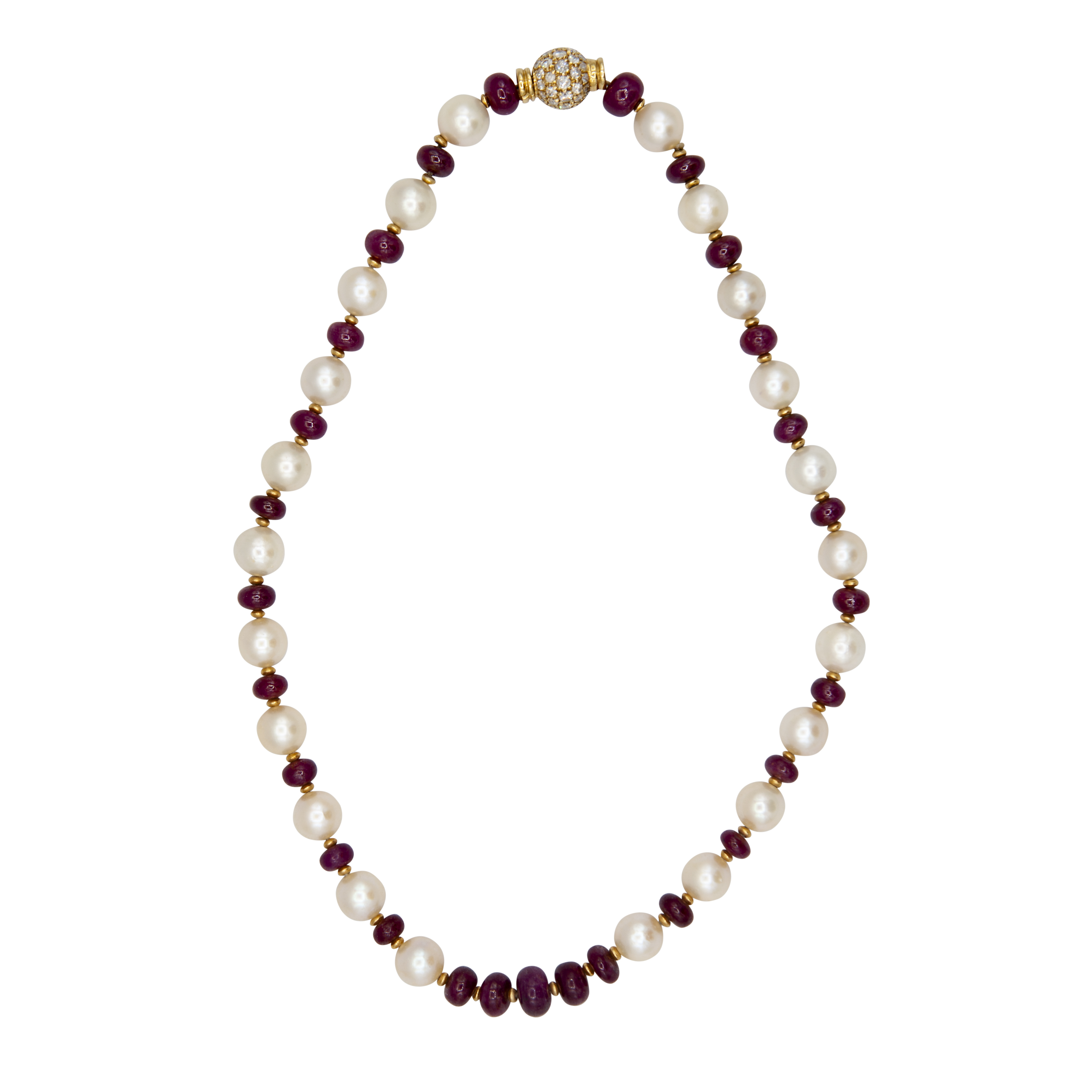Filo con pietre rosse e sfere. Chiusura in oro 18 kt e brillanti. Peso 45,1 gr