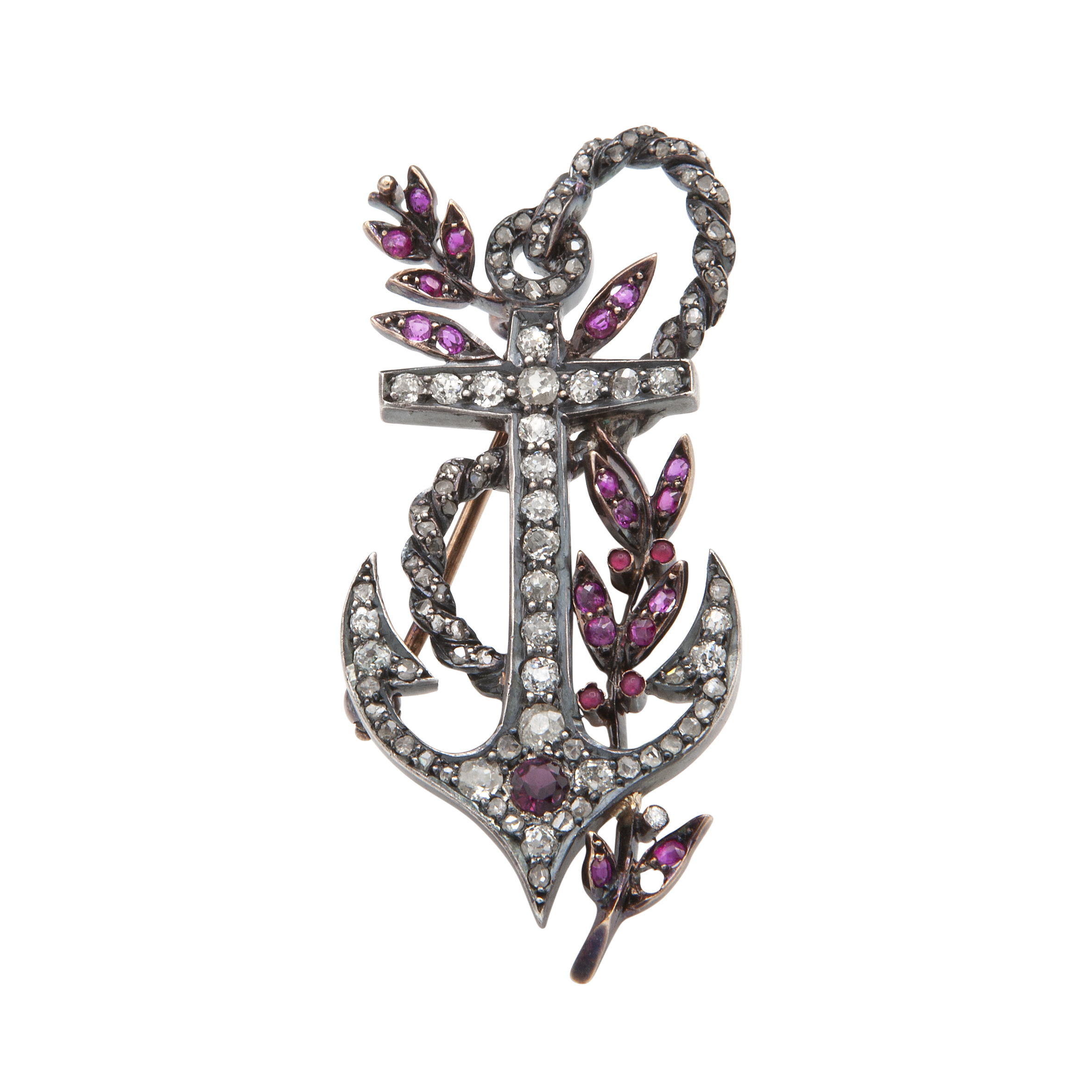 Fine '800, spilla a forma di ancora con diamanti old european cut e rubini. Peso 14,1 gr. Misura 5,5x3 cm