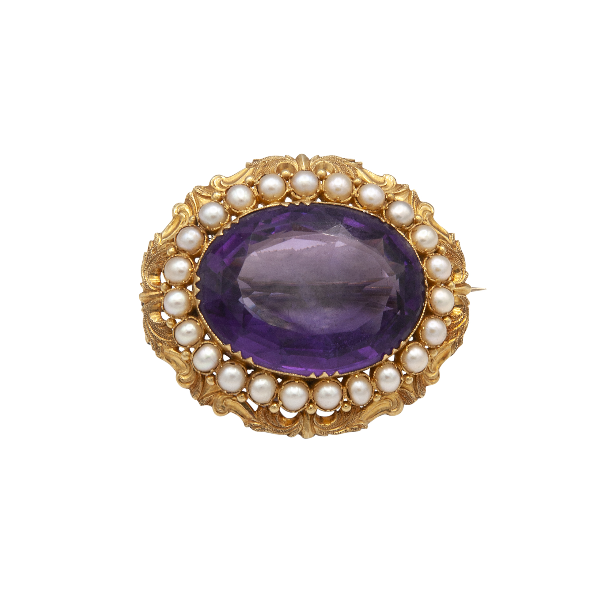 Spilla con ametista centrale e perline. Peso complessivo 12,40 gr.