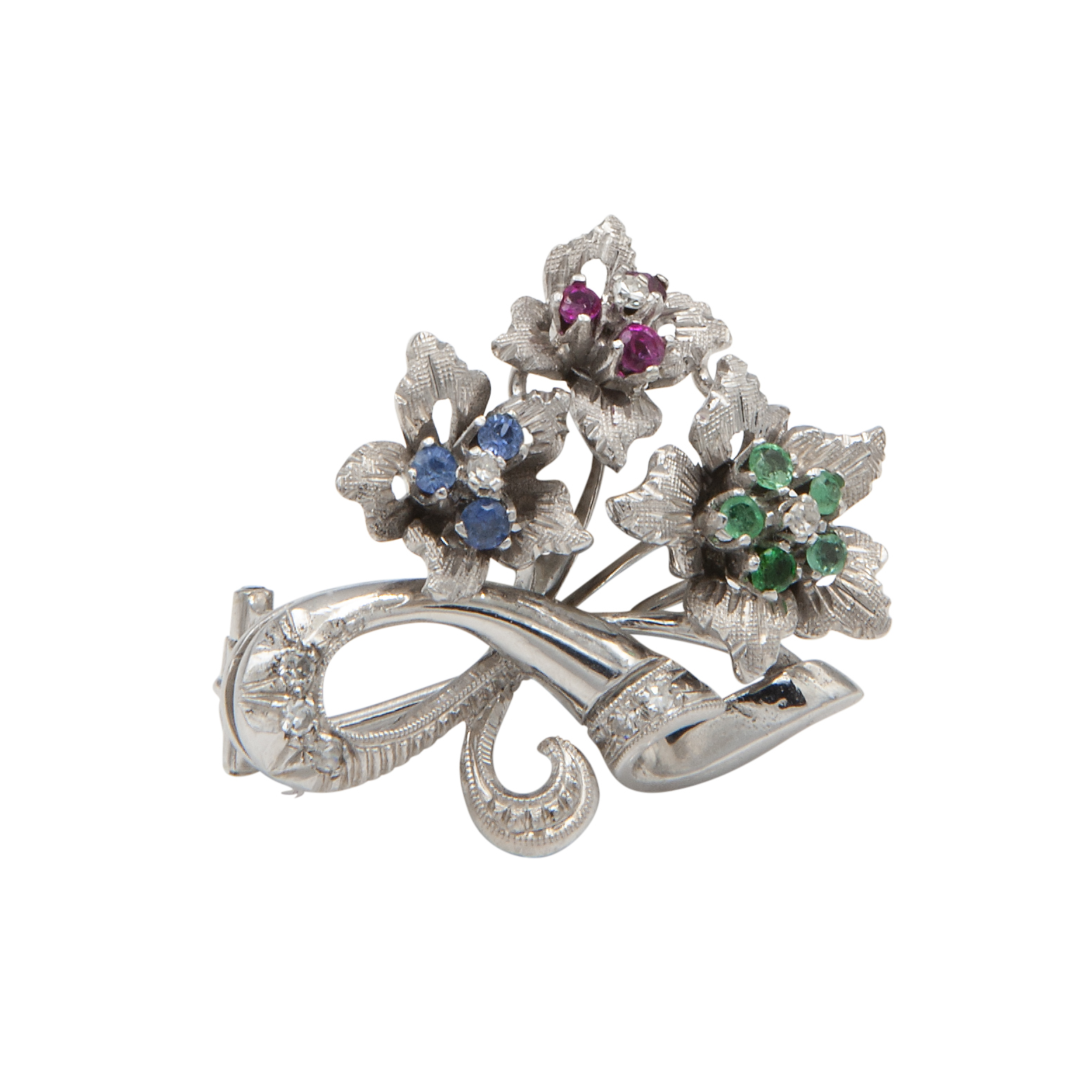 Spilla in oro 18 kt a forma di bouquet con zaffiri, smeraldi e rubini. Peso complessivo 7,8 gr.