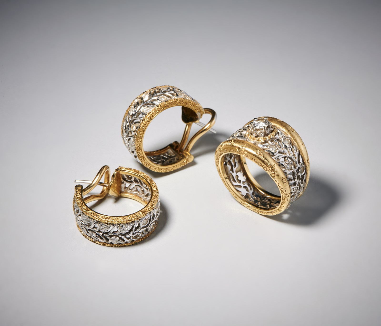 Anello e paio di orecchini in oro bianco e giallo 750/1000 con diamante centrale [..]
