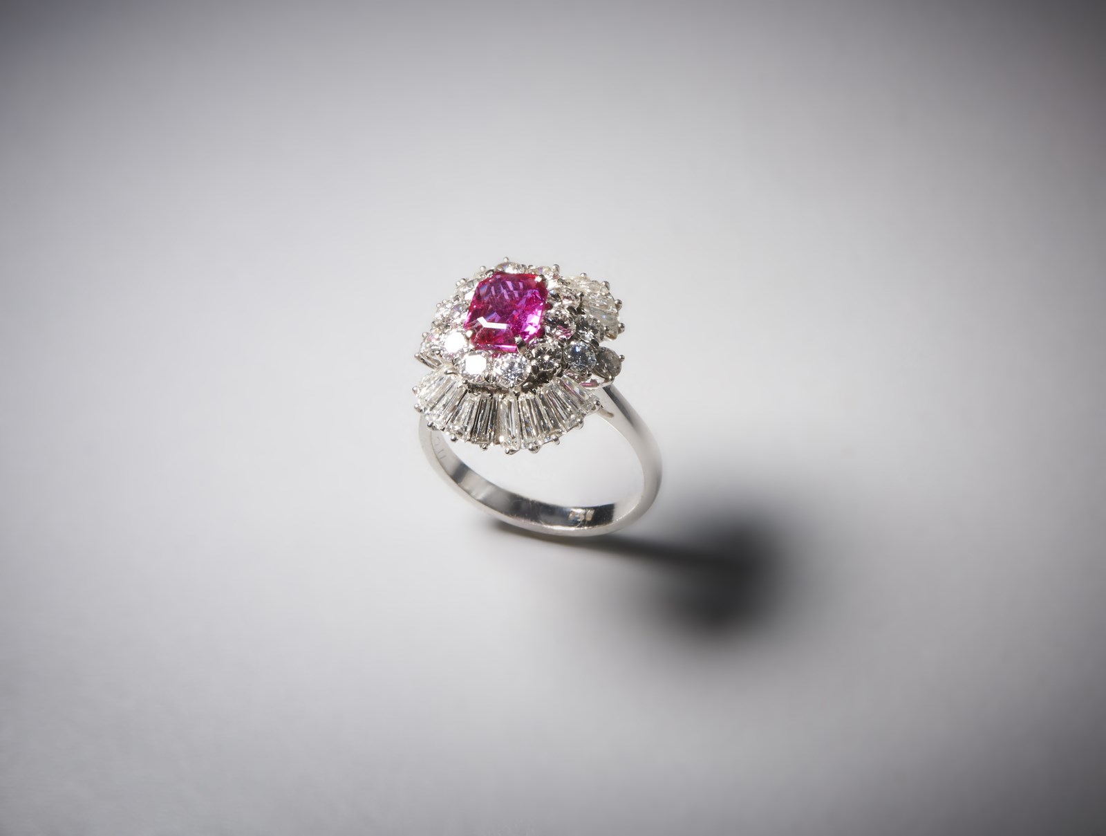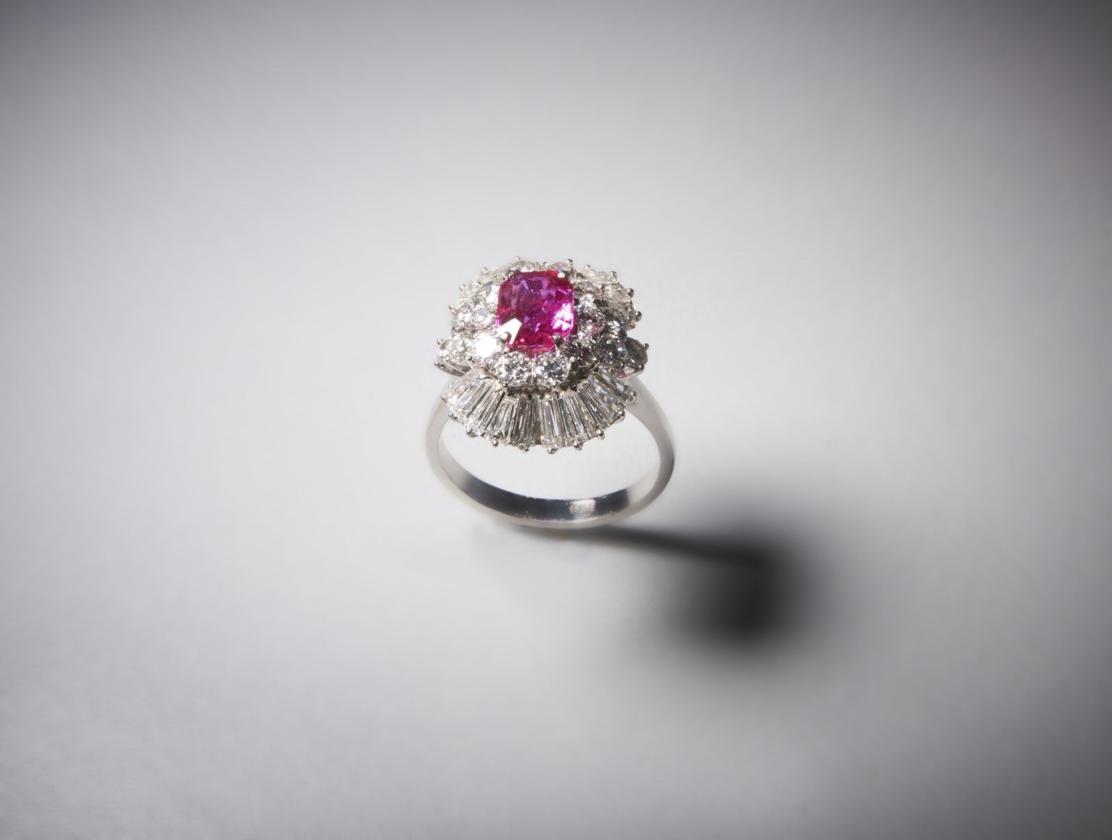 Elegantissimo anello in oro bianco 750/1000 con diamanti taglio brillante circa 3,80 ct e diamanti baguette 3,00 ct. circa col. G/H vvs/Vs e rubino di colore rosato ''vivido'' del peso di ct. 1,50 circa .Peso lordo 5,10 gr.