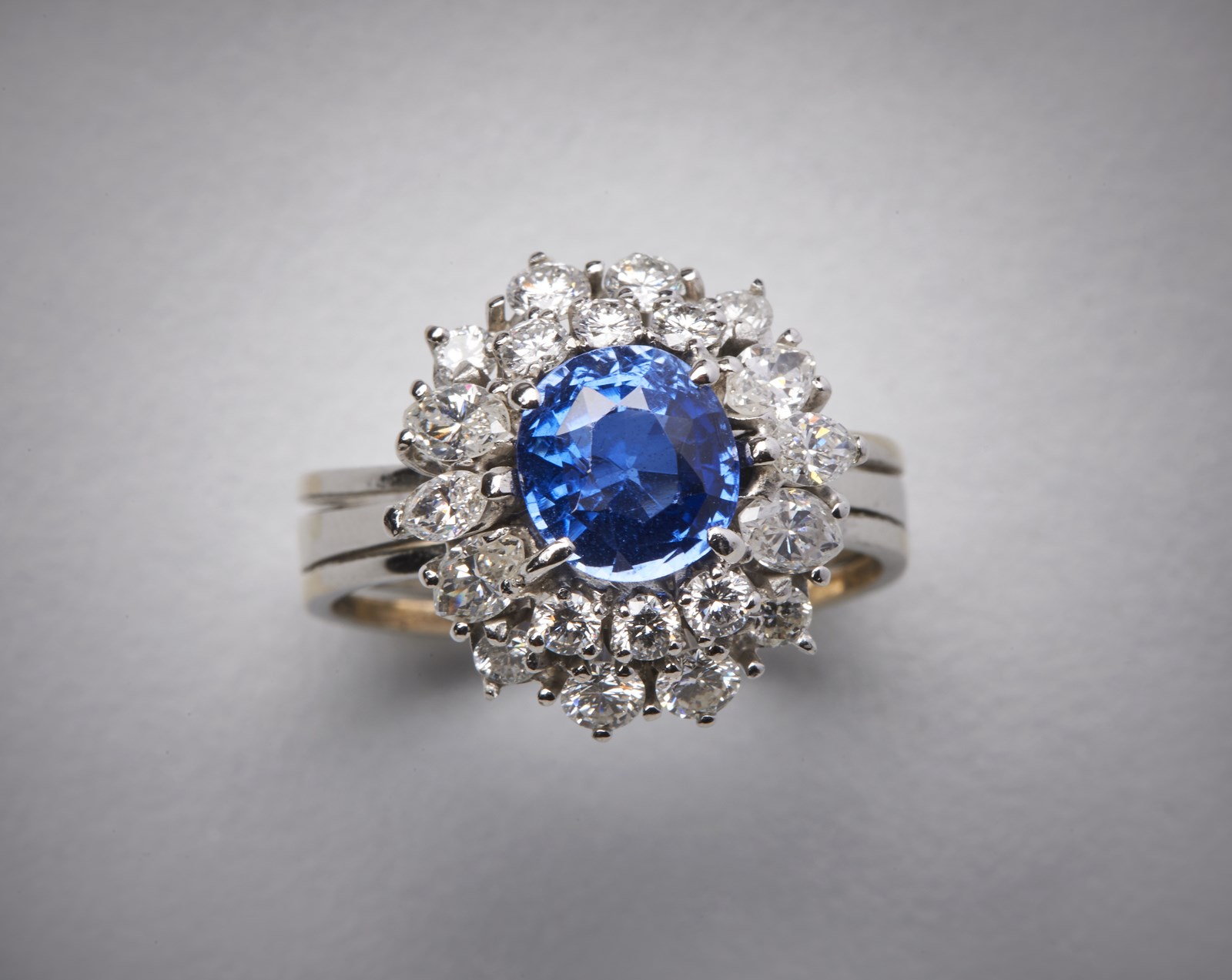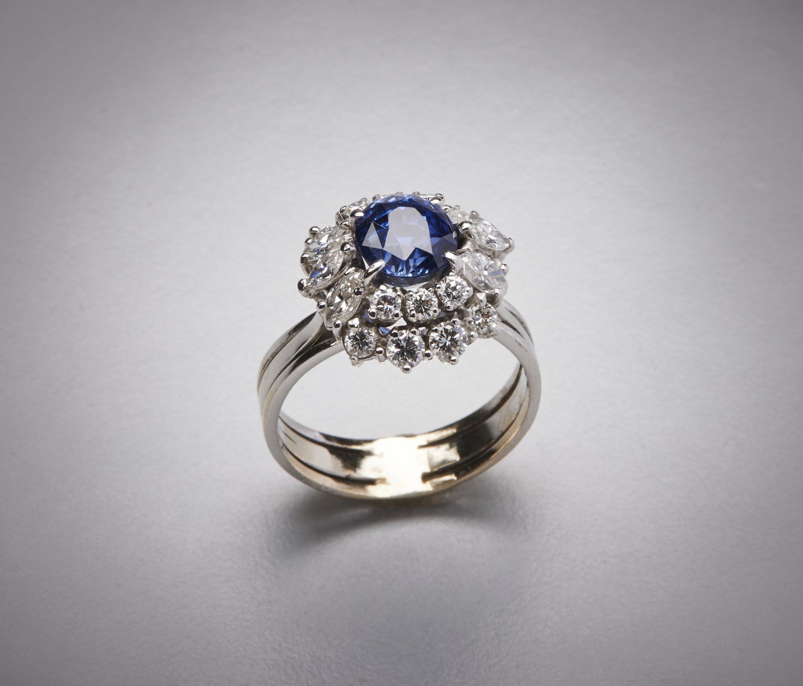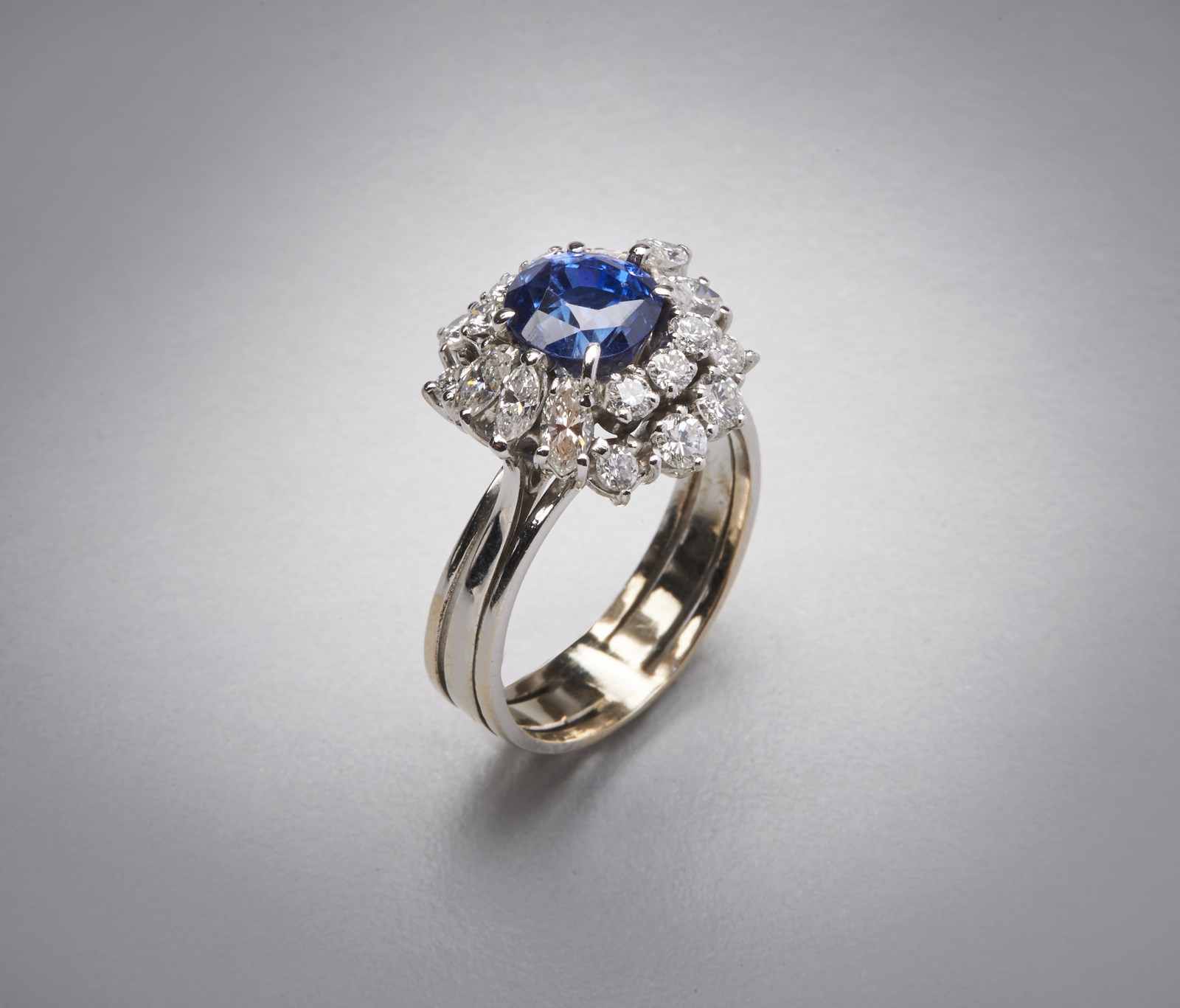 Anello in oro bianco 750/1000 con zaffiro ovale blu.