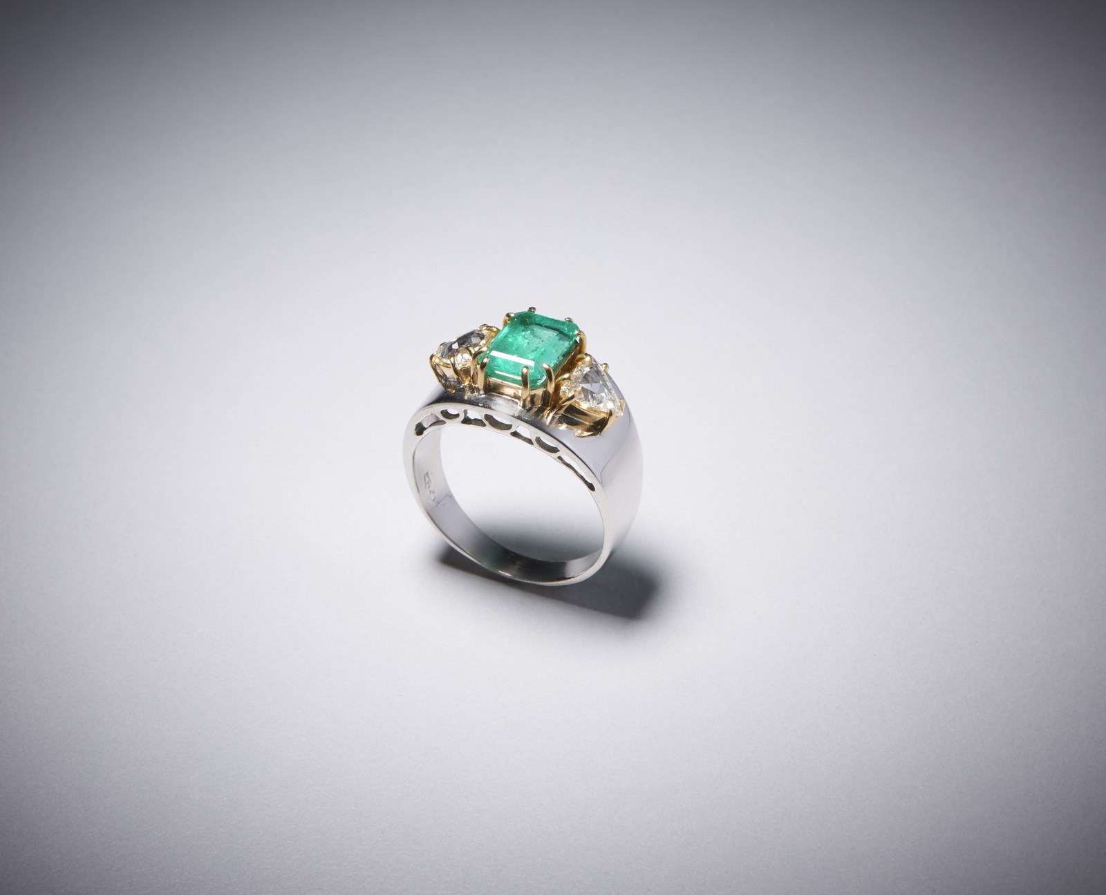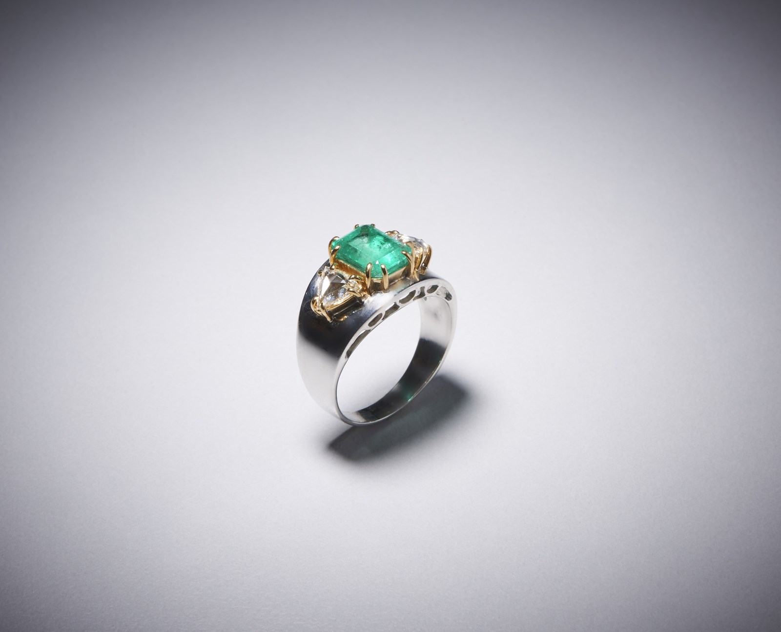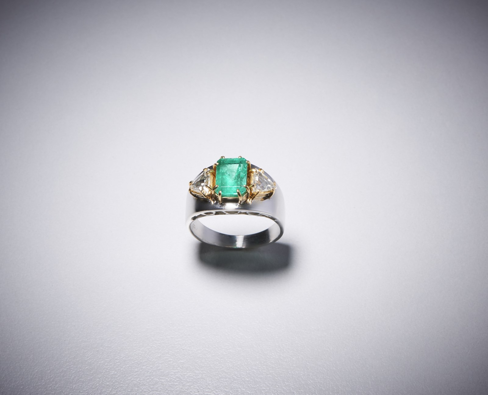Anello in oro bianco 750/1000 con smerlando centrale taglio a smeraldo probabimente di origine colombiana di circa 1,70 carati e due diamanti a triangolo taglio a rose di circa 0,70 carati Peso lordo 6,12 gr.