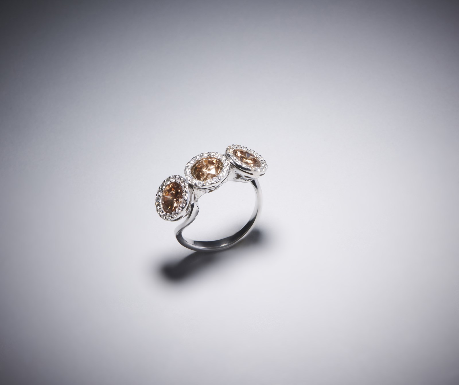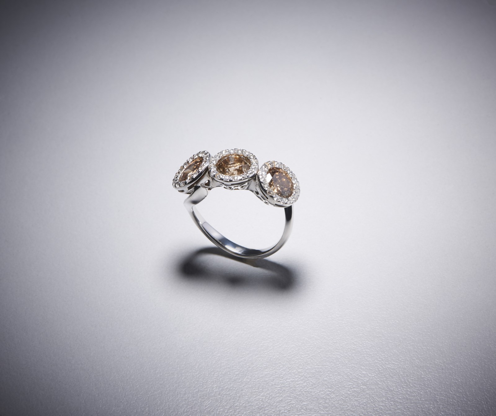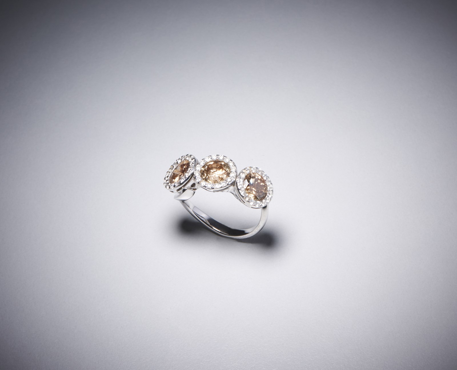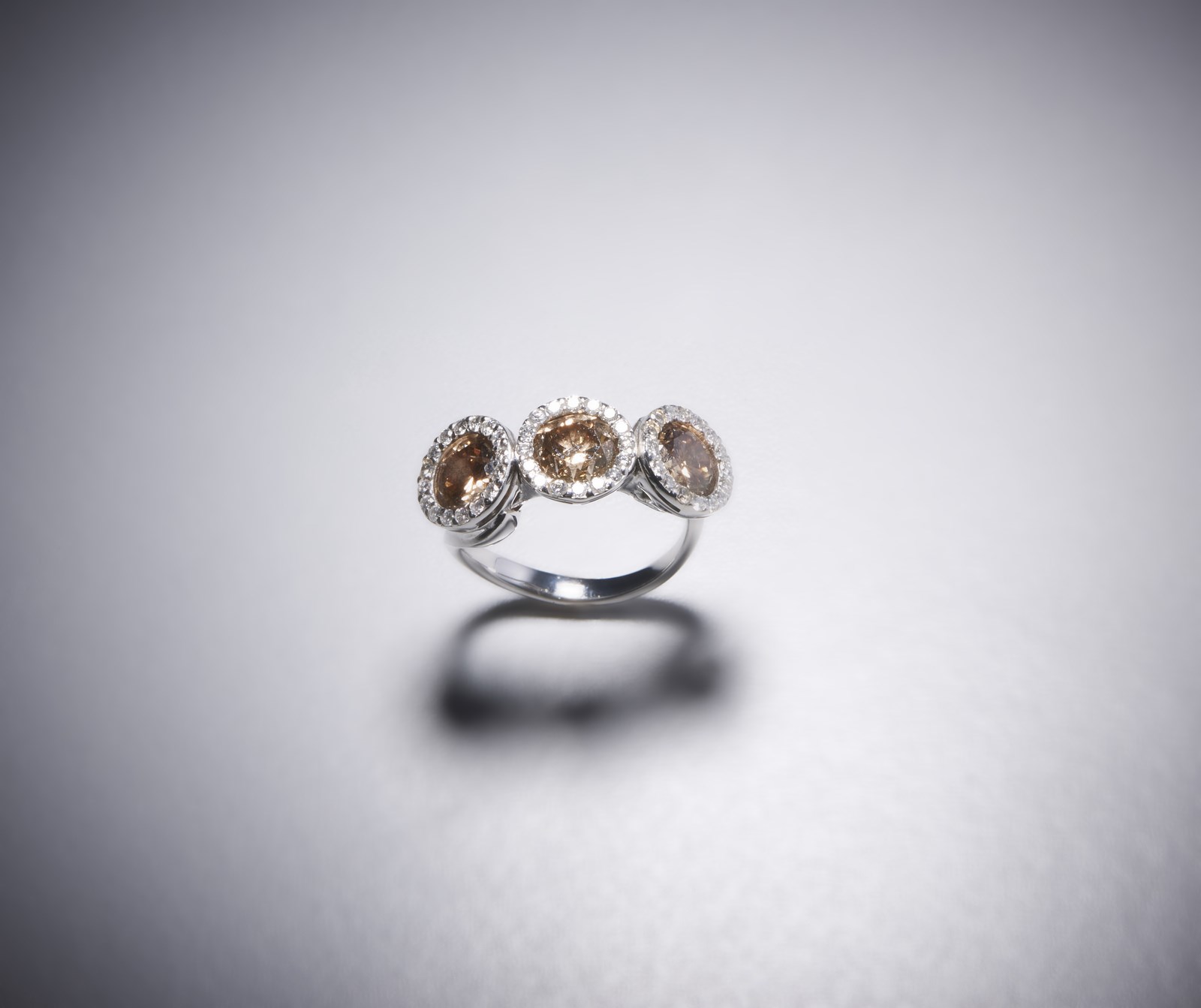 Anello in oro bianco 750/1000 con n.3 diamanti brown taglio a brillante per 4,00 carati circa totali e pavè di diamanti bianchi taglio misto di circa 1,30 carati. Peso lordo 6,88 gr.