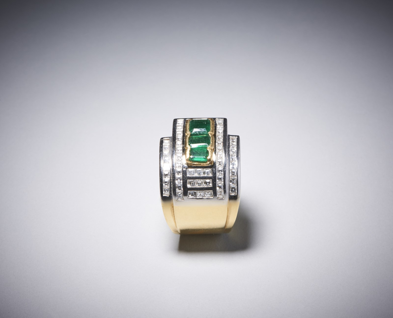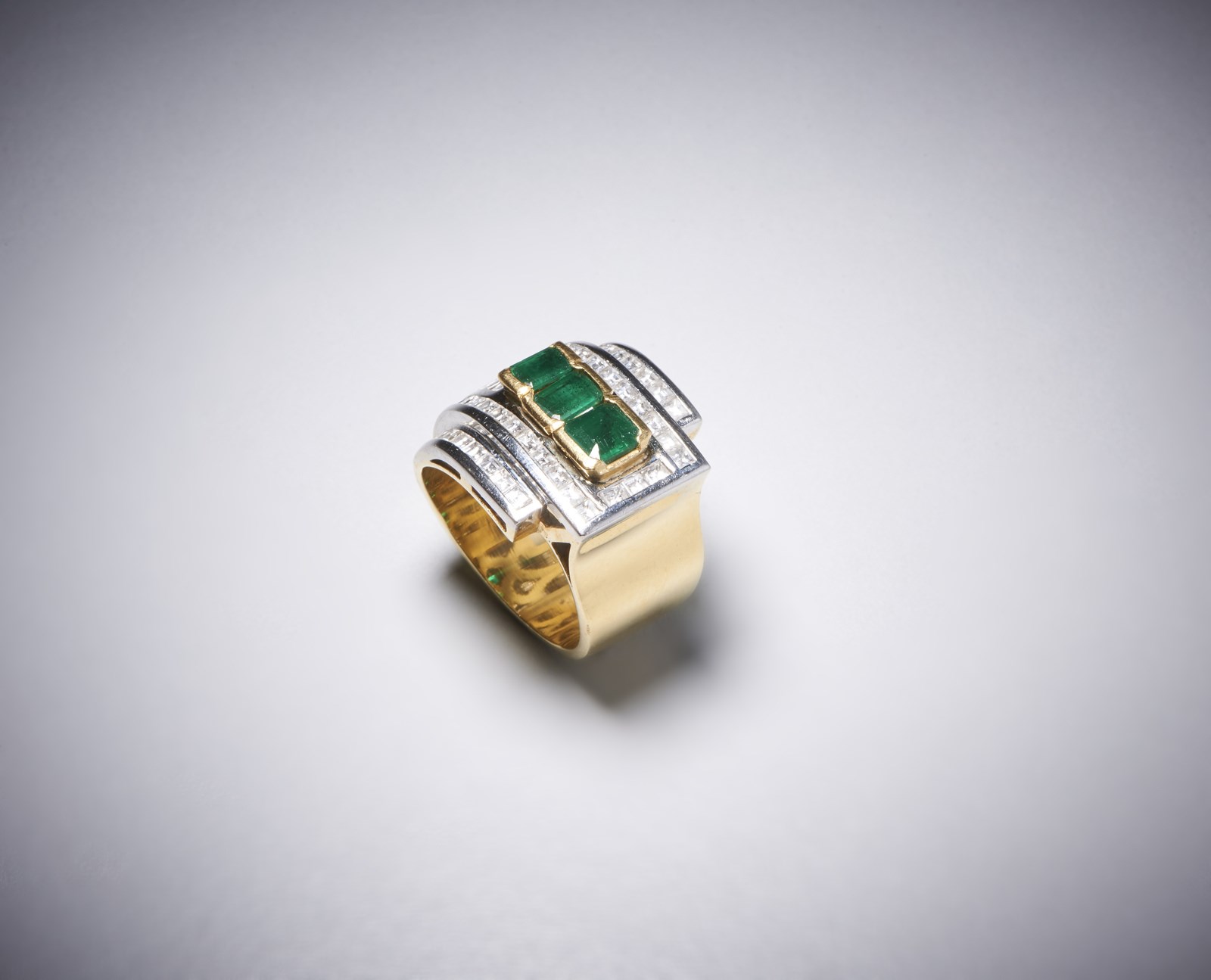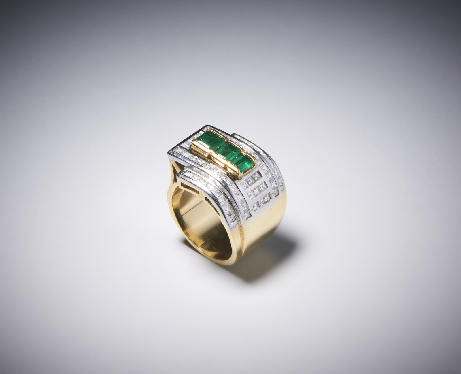 Anello da cocktail in oro giallo 750/1000 con n, 3 smeraldi taglio a smeraldo di circa 1,50 carati e carrè di diamanti bianchii di circa 1,50 caratiPeso lordo 23,10 gr
