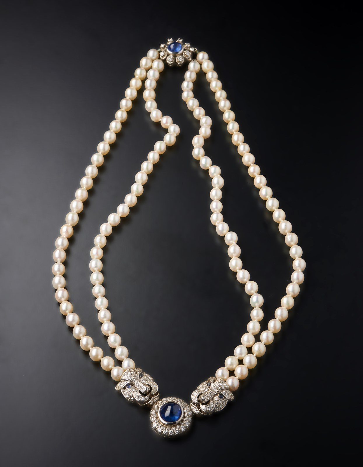 Il ciondolo centrale reca al centro uno zaffiro blu cabochon di colore blu intenso. di ct. 5,00 circa Lo zaffiro è contronato da pavè di diamanti bianchi ed ai lati è sostenuto da due teste di leopardo con pavè di diamanti bianchi. Chiusura contrornata da diamanti bianchi e recante zaffiro blu ovale cabocon.