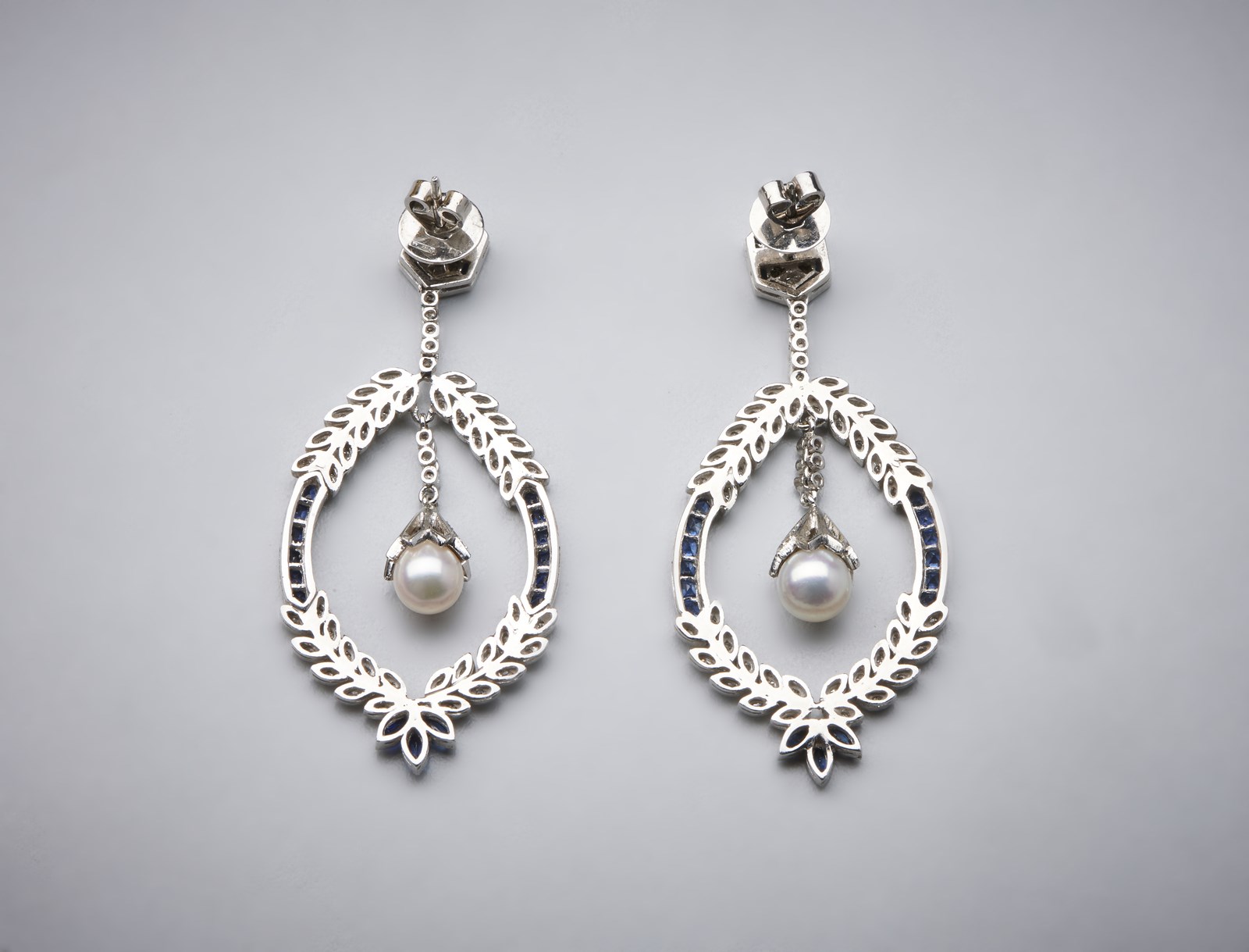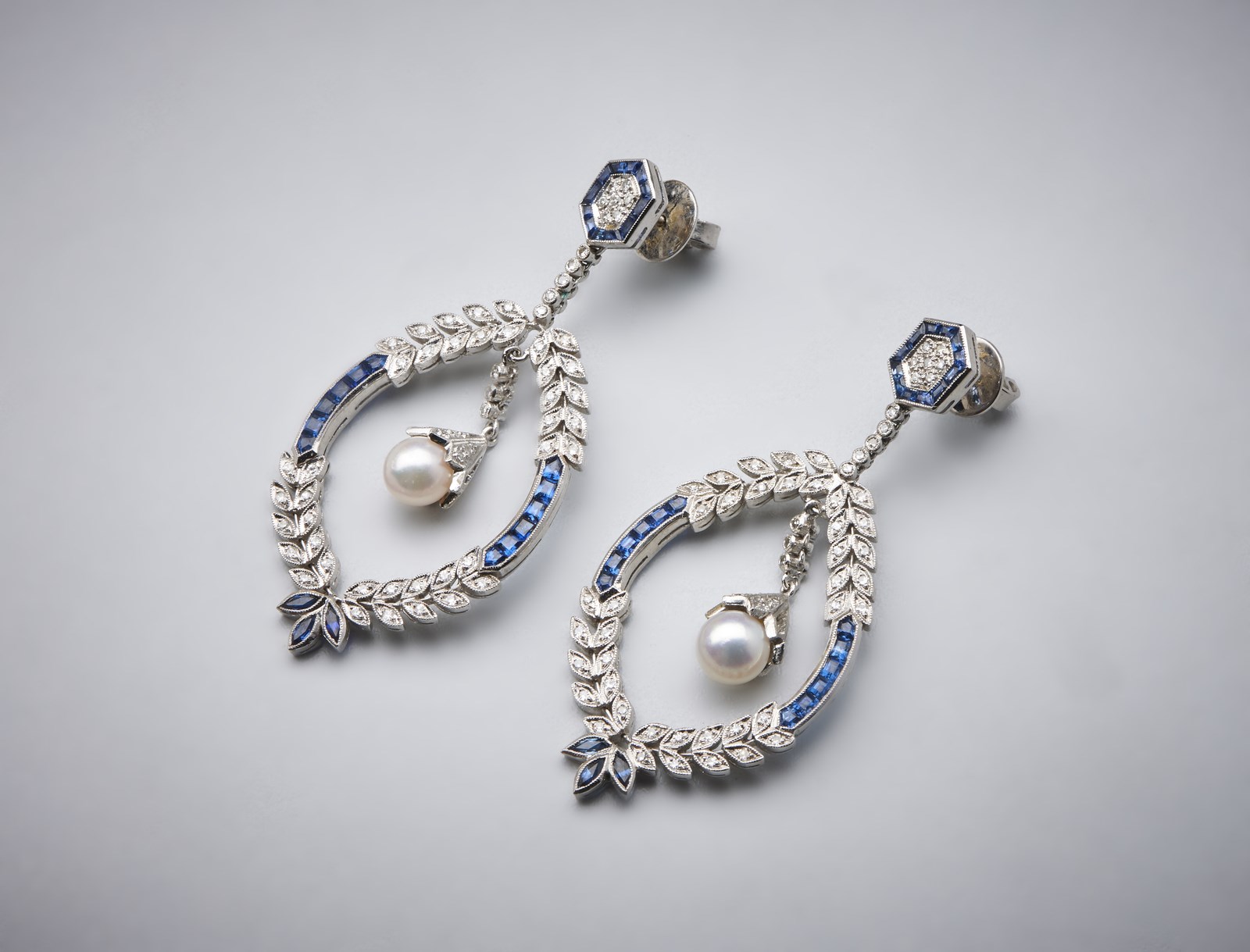 Deliziosi orecchini stile ''Liberty'' raffiguranti corona triumphalis con perle pendenti all'interno contornate di piccoli diamanti e zaffiri blu.Peso lordo 21,80 gr.