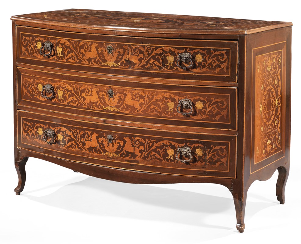 Cassettone lastronato e intarsiato in legno di noce, mogano e ciliegio