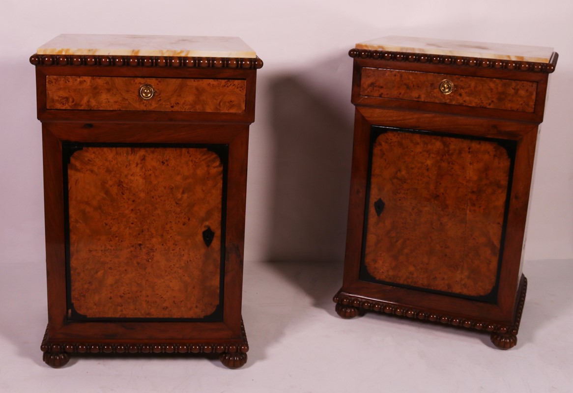 Coppia di grandi comodini lastronati in legno di piuma e noce