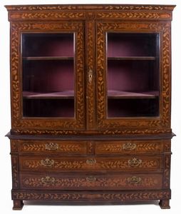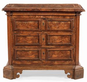 Piccolo cassettone lastronato in radica di noce con filetto in legno di ciliegio