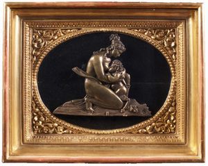 Bassorilievo in bronzo in cornice intagliata e dorata, cm. 19x22 (bassorilievo) e cm. 37x45 (cornice)