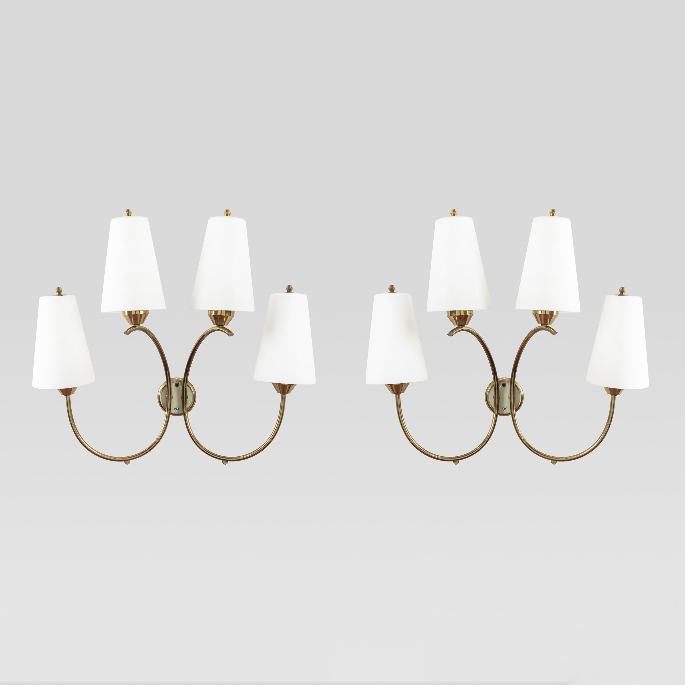 Italia, anni 50-60 coppia di lampade da parete in ottone e vetro satinato, marchi della produzione