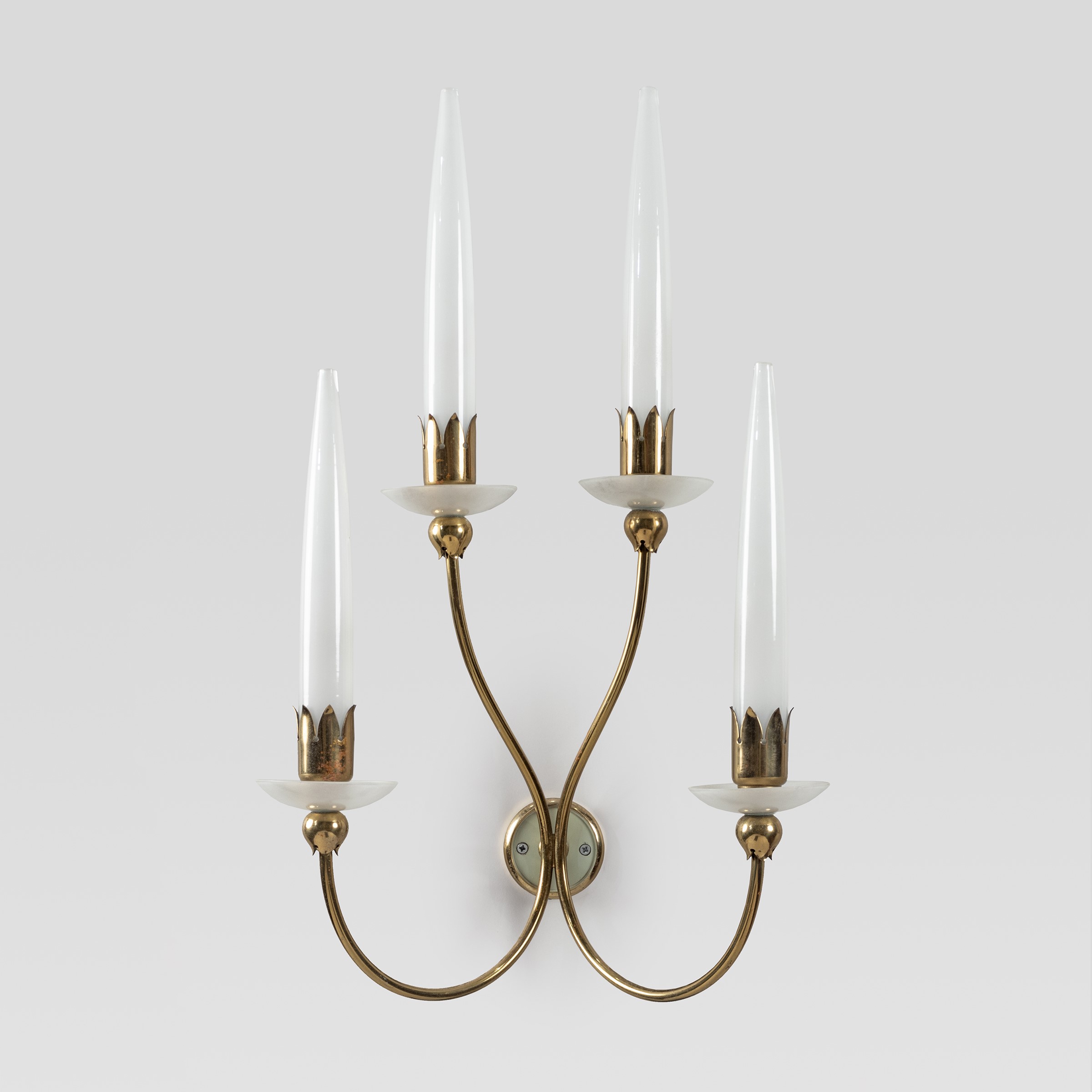 Italia, anni 50-60 lampada da parete in ottone e vetro satinato, marchio della produzione