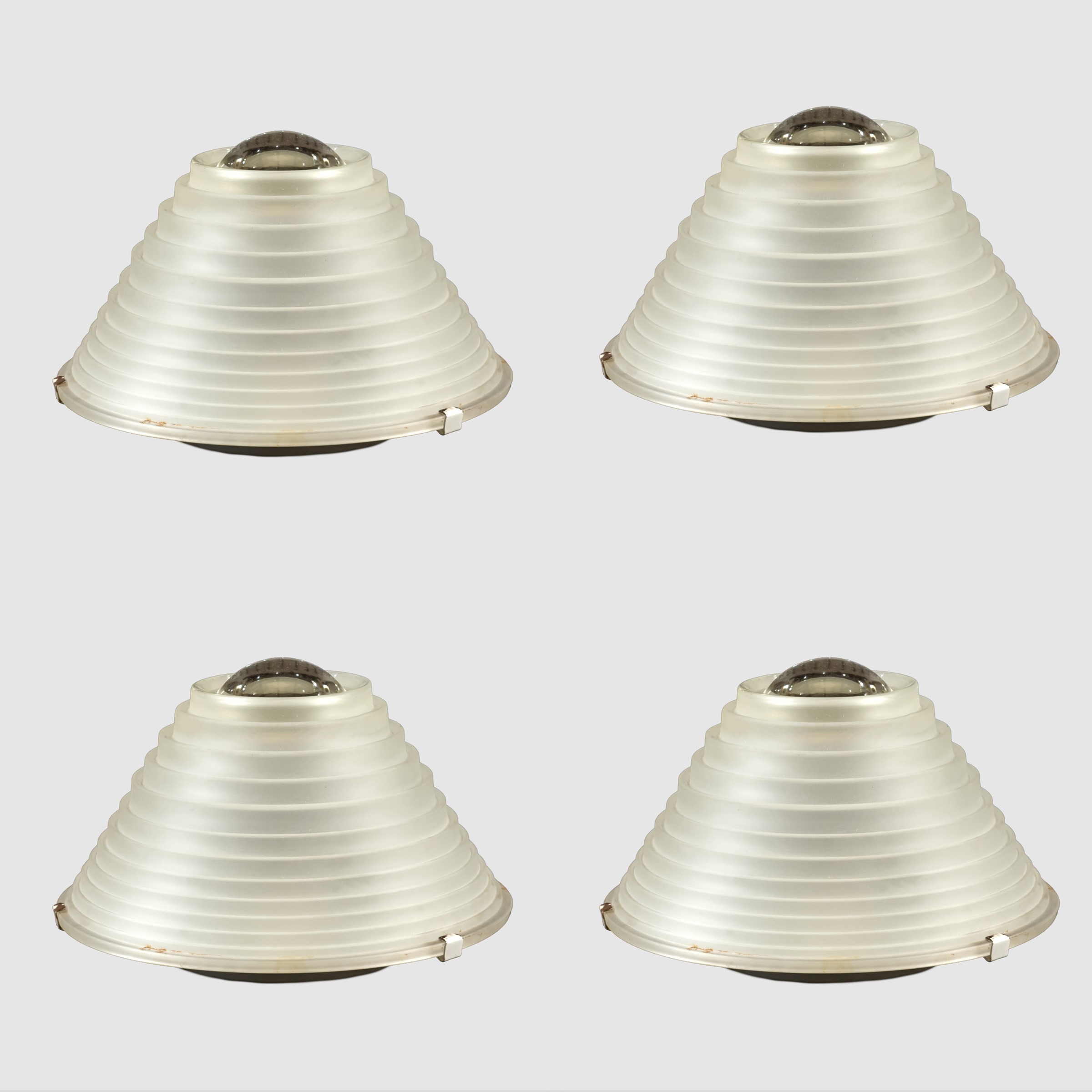 Italia, anni 70-80 quattro lampade da soffitto mod. Egina in vetro satinato con lente d'ingrandimento e metallo
