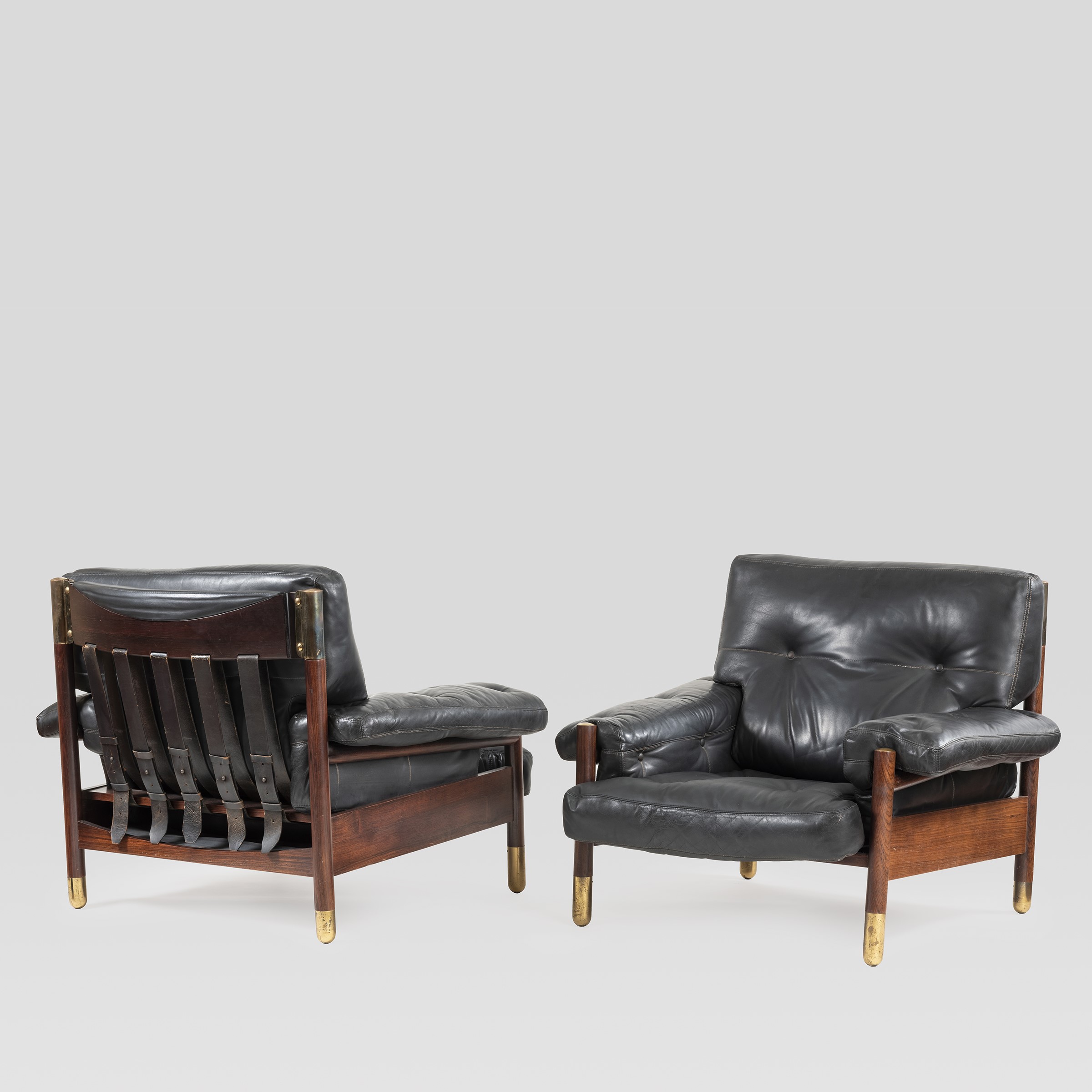 Italia, anni 60 coppia di poltrone mod. Sella in legno, ottone e pelle imbottita